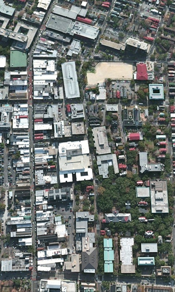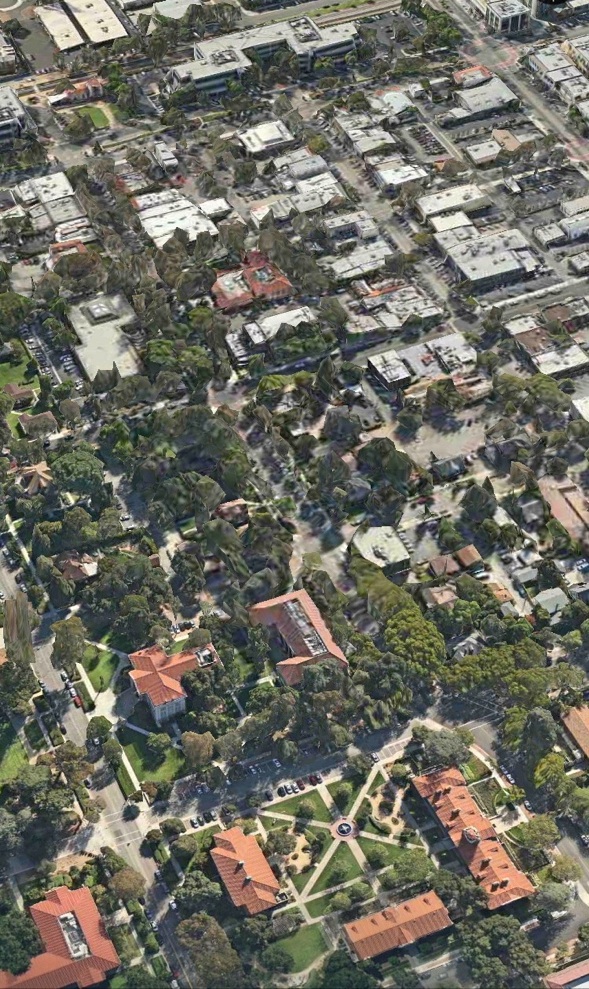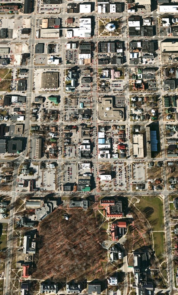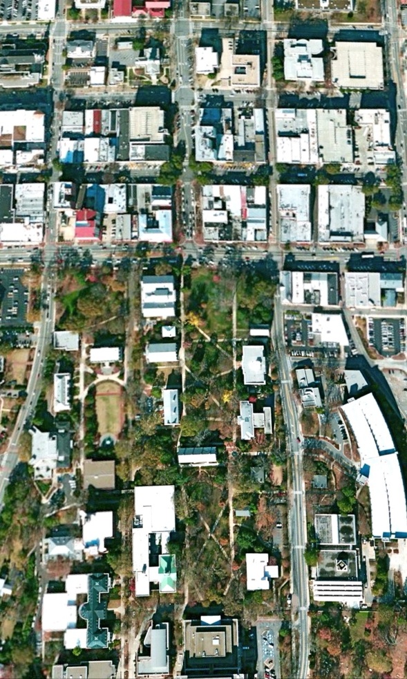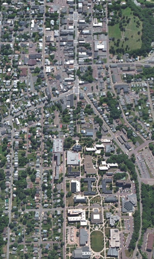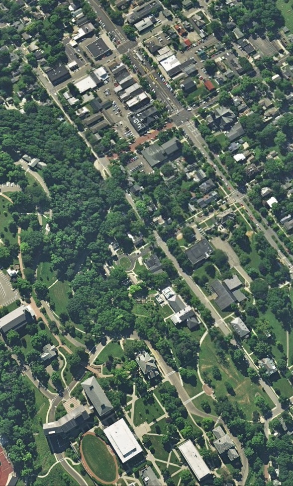 Birds-eye views showing the walkable connection between “gown and town”