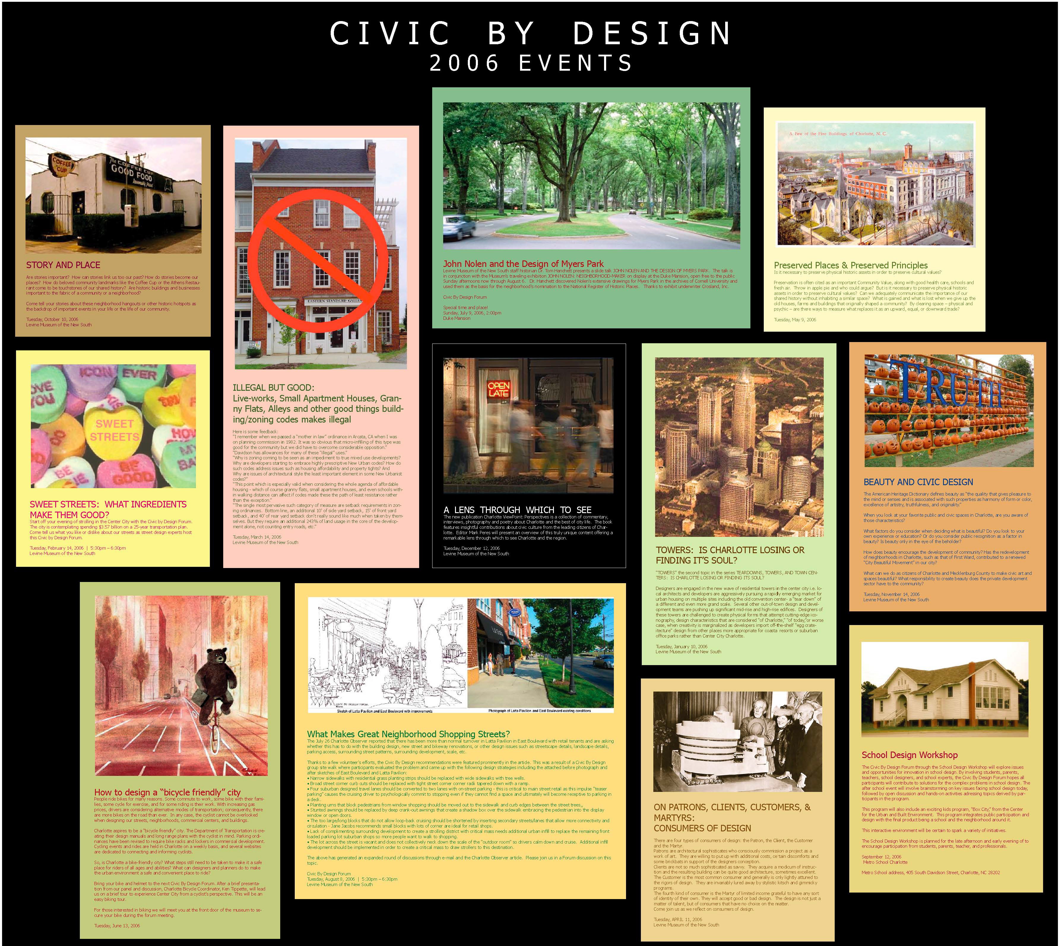 The Civic By Design Forum was launched in 2005, when architect and planner Tom Low and the Levine Museum of the New South’s staff historian Tom Hanchett collaborated on an exhibit about John Nolen, planner of Myers Park. Tom Low realized there needed to be a place in Charlotte where we can get people talking to each other about civic design issues that are shaping our city’s history today. Tom Hanchett agreed and offered the Levine Museum of the New South as a neutral ground venue.